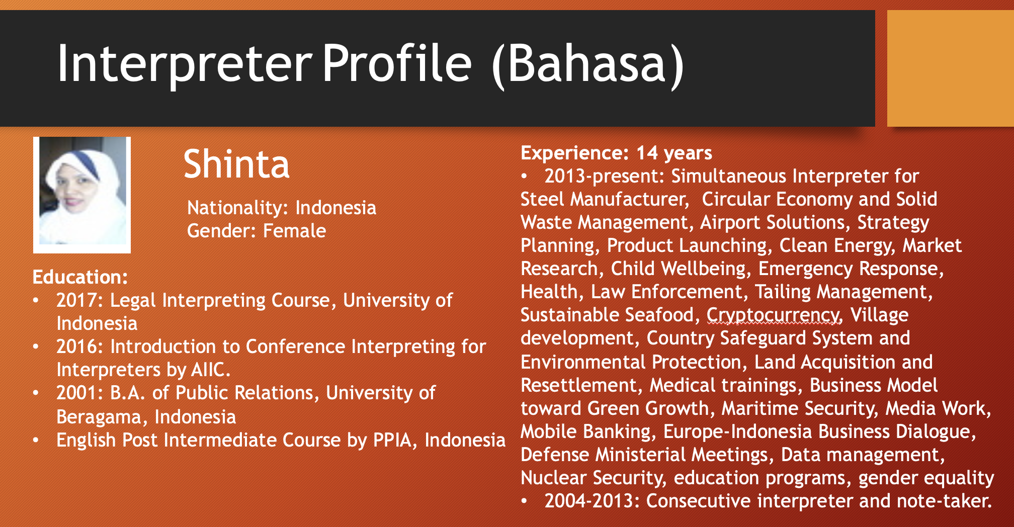 เอเชียคอนเนคต์ คอนซัลติ้ง แอนด์ เทรด (0805568001084) เป็นผู้ให้บริการภาษาในเวลายาวนาน พร้อมล่ามภาษาเป็นเจ้าของภาษาที่มีคุณภาพจากหลากหลายประเทศดังต่อไปนี้