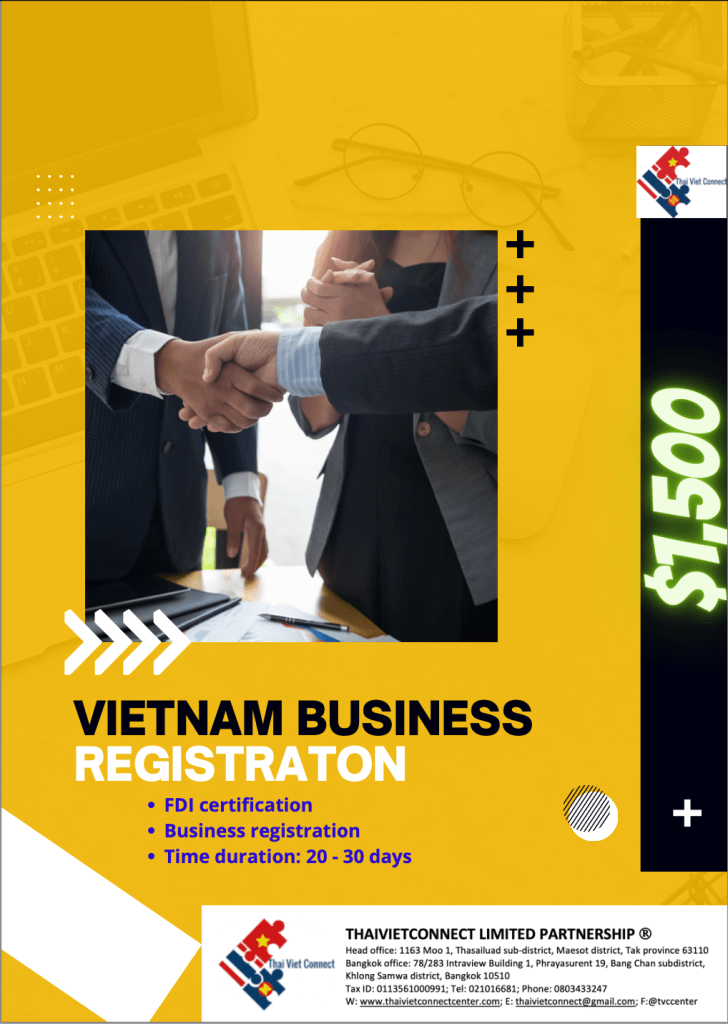 - จดทะเบียนบริษัทจำกัด ในกรณีมีหุ้นส่วนเวียดนาม/ไทย ราคาเริ่มต้น 7,000 THB ระยะเวลา < 7 วันทำการ